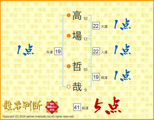 あなたの人生を表す1番重要な運勢です。生涯を通じて影響する総合運となり、主に50歳以降の晩年期に影響を及ぼします。苗字と名前の合計画数。