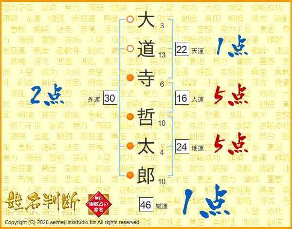 大(3画)道(13画)寺(6画) 哲(10画)太(4画)郎(10画)