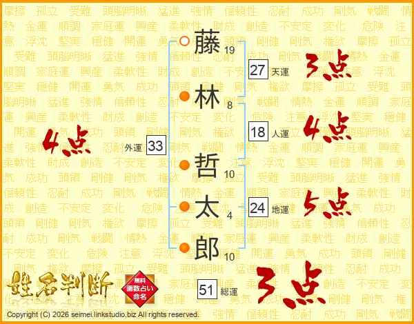 藤(19画)林(8画) 哲(10画)太(4画)郎(10画)