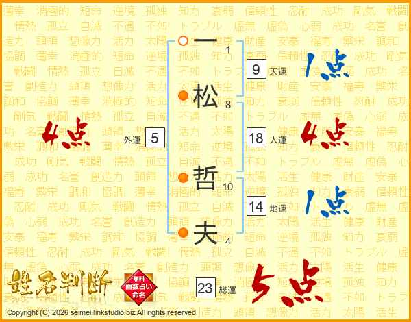 あなたの人生を表す1番重要な運勢です。生涯を通じて影響する総合運となり、主に50歳以降の晩年期に影響を及ぼします。苗字と名前の合計画数。