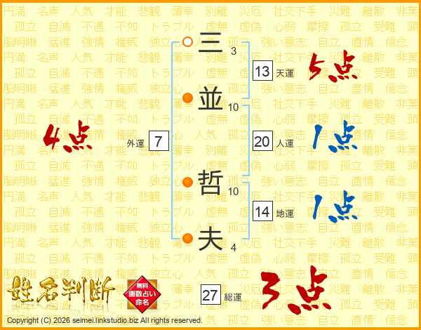 生活面を象徴する運勢です。外部から受ける影響力を表し、結婚運、家庭運や職場、環境への順応性を表します。総運から人運を引いた画数。姓や名が1文字の場合を除く。