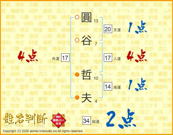 圓(13画)谷(7画) 哲(10画)夫(4画)