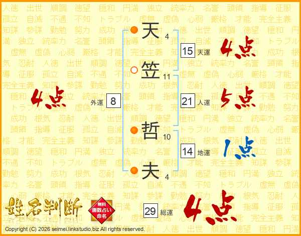 天(4画)笠(11画) 哲(10画)夫(4画)