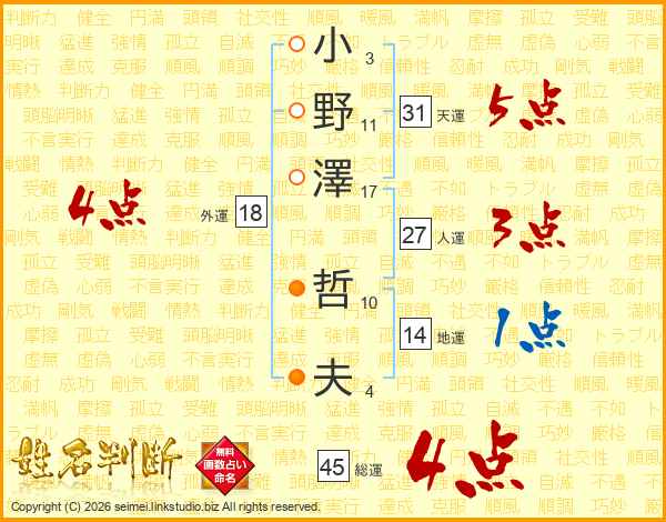 小(3画)野(11画)澤(17画) 哲(10画)夫(4画)