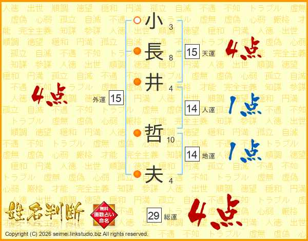 小(3画)長(8画)井(4画) 哲(10画)夫(4画)