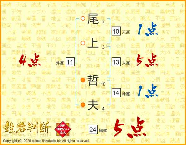 尾(7画)上(3画) 哲(10画)夫(4画)