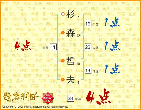 杉(7画)森(12画) 哲(10画)夫(4画)