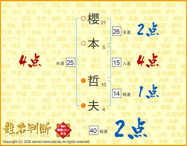櫻(21画)本(5画) 哲(10画)夫(4画)