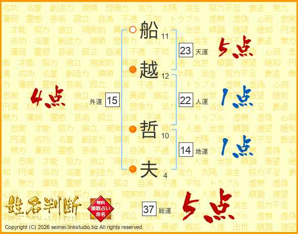 船(11画)越(12画) 哲(10画)夫(4画)