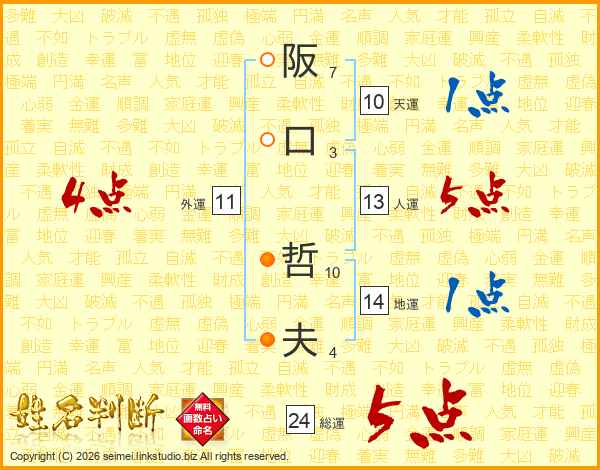 阪(7画)口(3画) 哲(10画)夫(4画)