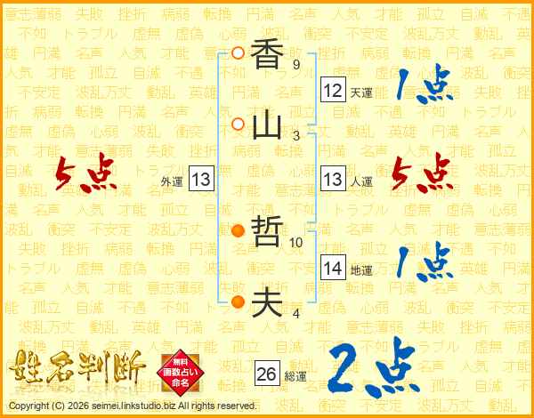 生活面を象徴する運勢です。外部から受ける影響力を表し、結婚運、家庭運や職場、環境への順応性を表します。総運から人運を引いた画数。姓や名が1文字の場合を除く。