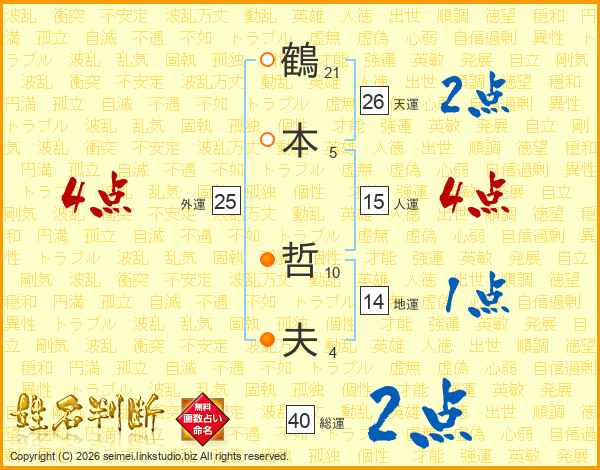 鶴(21画)本(5画) 哲(10画)夫(4画)