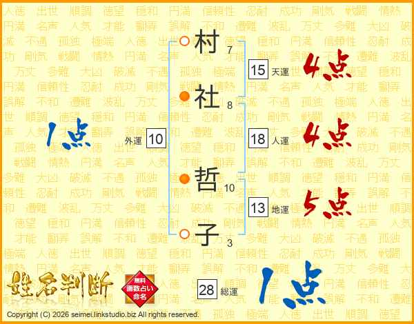 村(7画)社(8画) 哲(10画)子(3画)