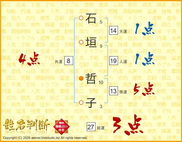 石(5画)垣(9画) 哲(10画)子(3画)