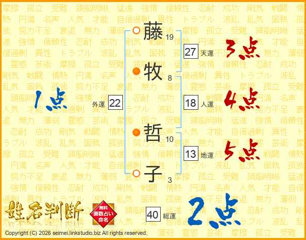 藤(19画)牧(8画) 哲(10画)子(3画)