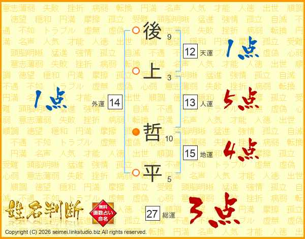 生活面を象徴する運勢です。外部から受ける影響力を表し、結婚運、家庭運や職場、環境への順応性を表します。総運から人運を引いた画数。姓や名が1文字の場合を除く。