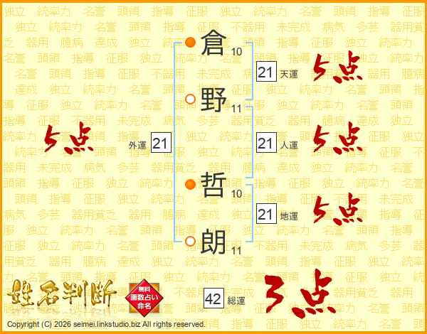 倉(10画)野(11画) 哲(10画)朗(11画)