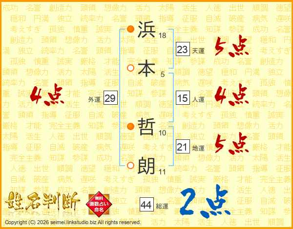 浜(18画)本(5画) 哲(10画)朗(11画)