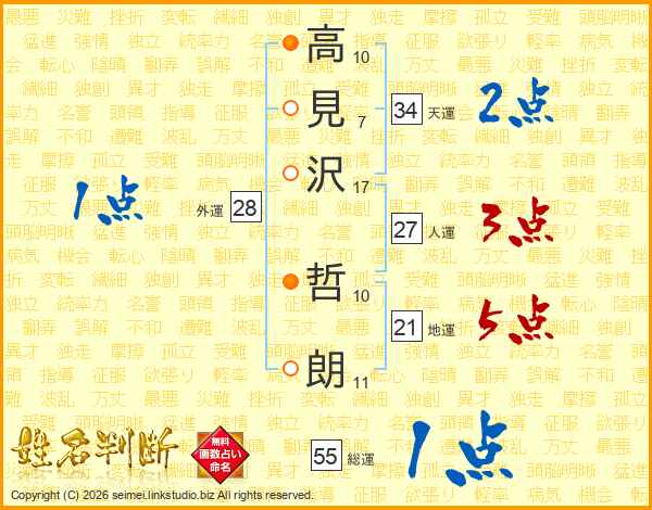 高(10画)見(7画)沢(17画) 哲(10画)朗(11画)