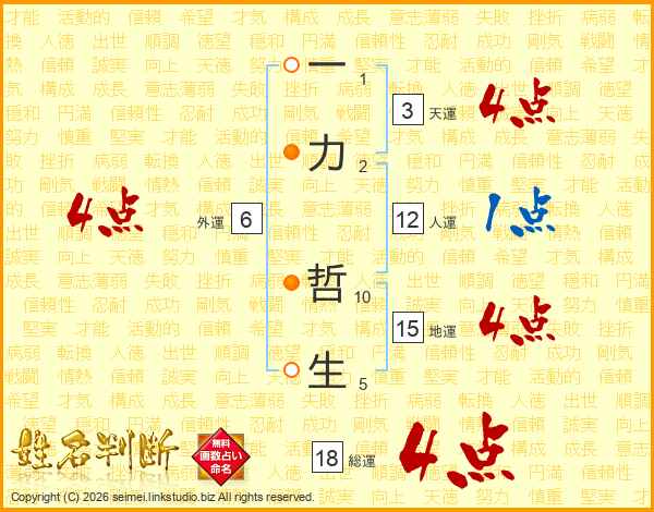 あなたの人生を表す1番重要な運勢です。生涯を通じて影響する総合運となり、主に50歳以降の晩年期に影響を及ぼします。苗字と名前の合計画数。