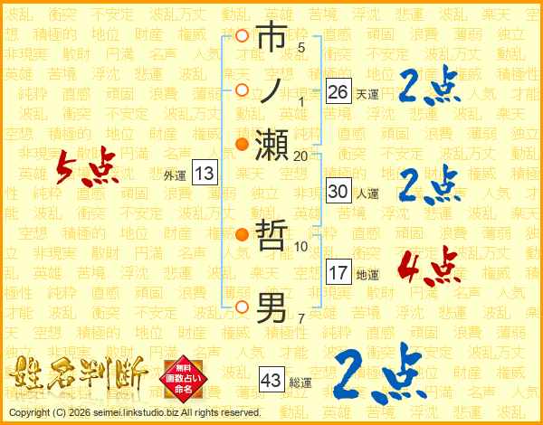 市(5画)ノ(1画)瀬(20画) 哲(10画)男(7画)