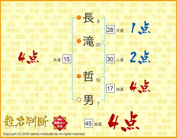 長(8画)滝(20画) 哲(10画)男(7画)