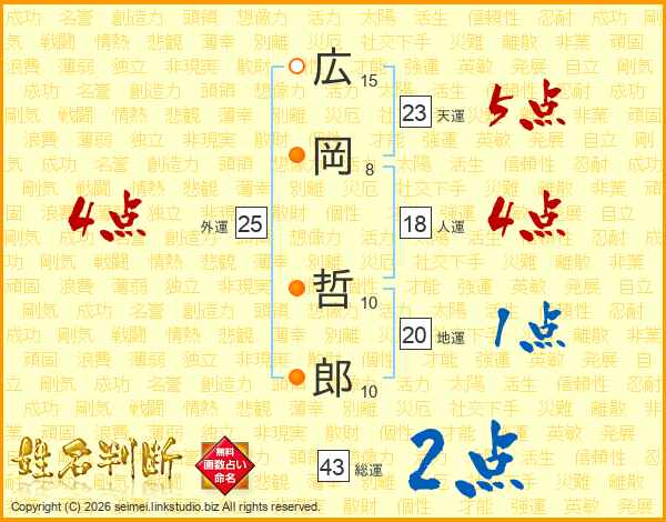 広(15画)岡(8画) 哲(10画)郎(10画)