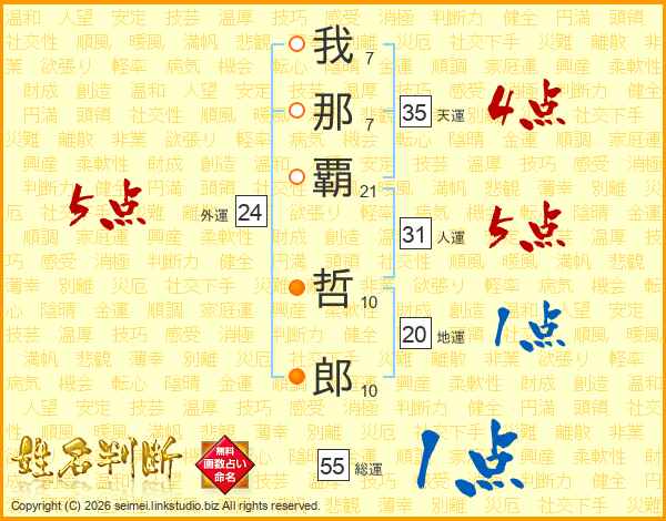 我(7画)那(7画)覇(21画) 哲(10画)郎(10画)