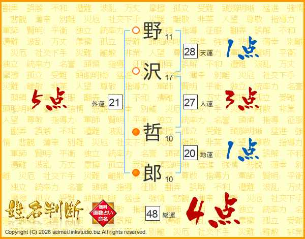 野(11画)沢(17画) 哲(10画)郎(10画)