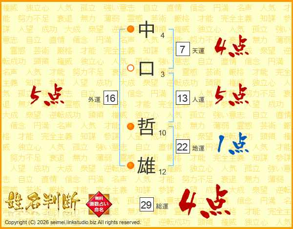 あなたの人生を表す1番重要な運勢です。生涯を通じて影響する総合運となり、主に50歳以降の晩年期に影響を及ぼします。苗字と名前の合計画数。