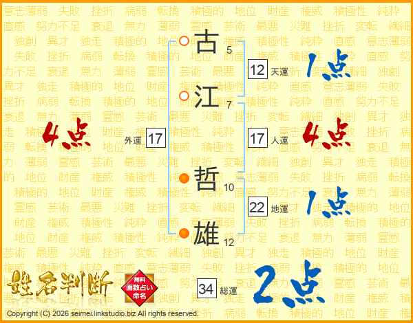 古(5画)江(7画) 哲(10画)雄(12画)