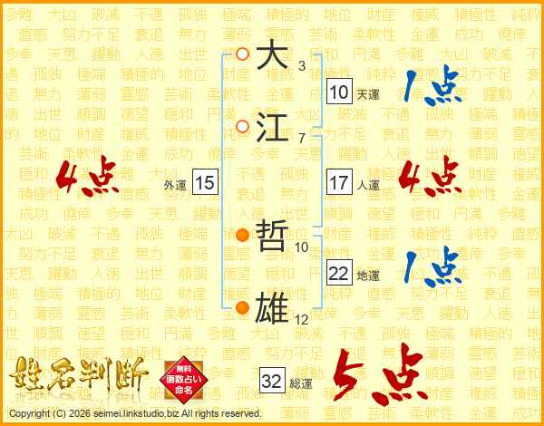 生活面を象徴する運勢です。外部から受ける影響力を表し、結婚運、家庭運や職場、環境への順応性を表します。総運から人運を引いた画数。姓や名が1文字の場合を除く。