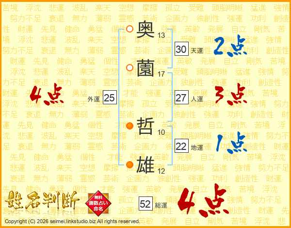 奥薗哲雄さんの総運は52画の4点!