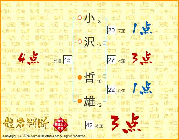 小(3画)沢(17画) 哲(10画)雄(12画)