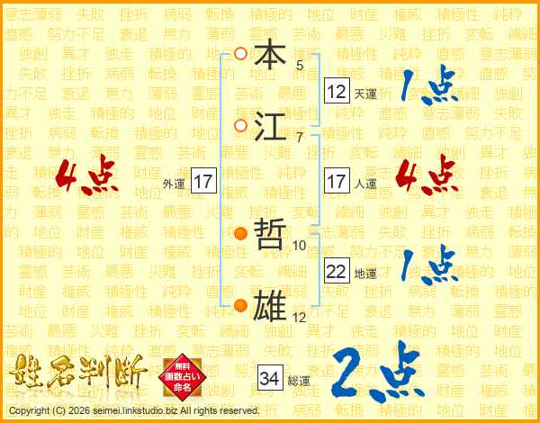 あなたの人生を表す1番重要な運勢です。生涯を通じて影響する総合運となり、主に50歳以降の晩年期に影響を及ぼします。苗字と名前の合計画数。