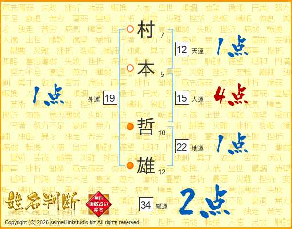 あなたの人生を表す1番重要な運勢です。生涯を通じて影響する総合運となり、主に50歳以降の晩年期に影響を及ぼします。苗字と名前の合計画数。