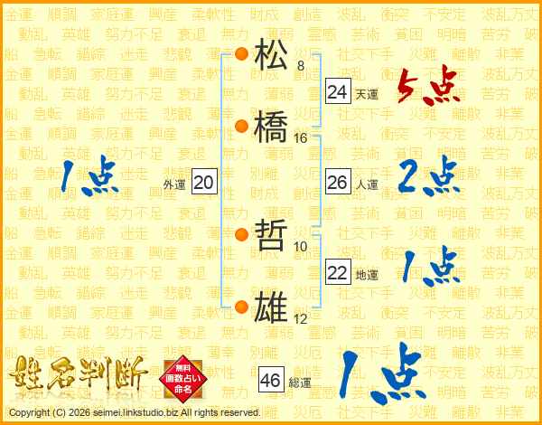 松(8画)橋(16画) 哲(10画)雄(12画)