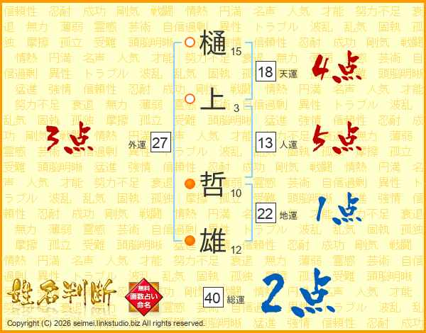 樋(15画)上(3画) 哲(10画)雄(12画)