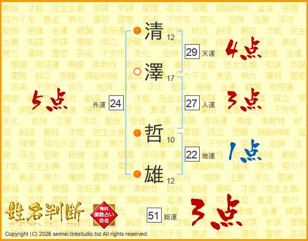 清(12画)澤(17画) 哲(10画)雄(12画)