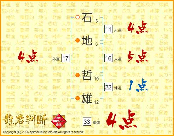 生活面を象徴する運勢です。外部から受ける影響力を表し、結婚運、家庭運や職場、環境への順応性を表します。総運から人運を引いた画数。姓や名が1文字の場合を除く。
