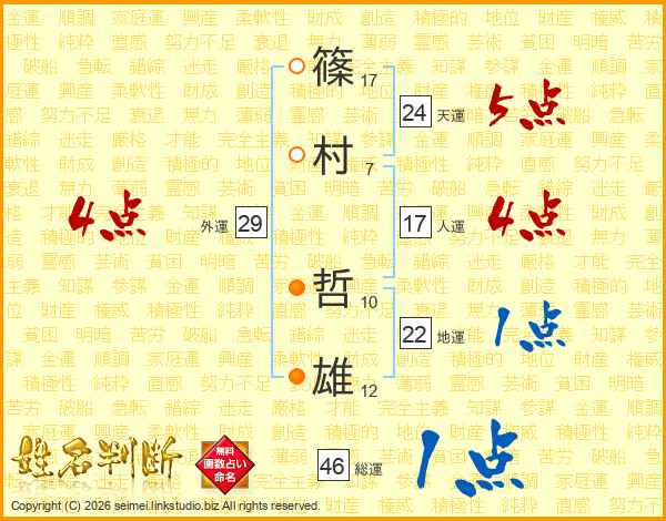 篠(17画)村(7画) 哲(10画)雄(12画)