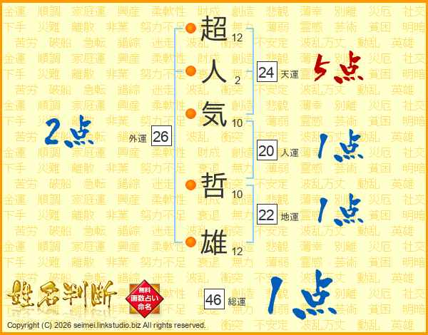 超(12画)人(2画)気(10画) 哲(10画)雄(12画)