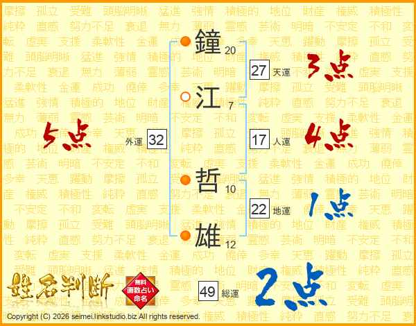 鐘(20画)江(7画) 哲(10画)雄(12画)
