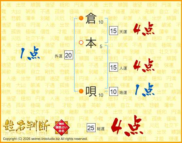 生活面を象徴する運勢です。外部から受ける影響力を表し、結婚運、家庭運や職場、環境への順応性を表します。総運から人運を引いた画数。姓や名が1文字の場合を除く。