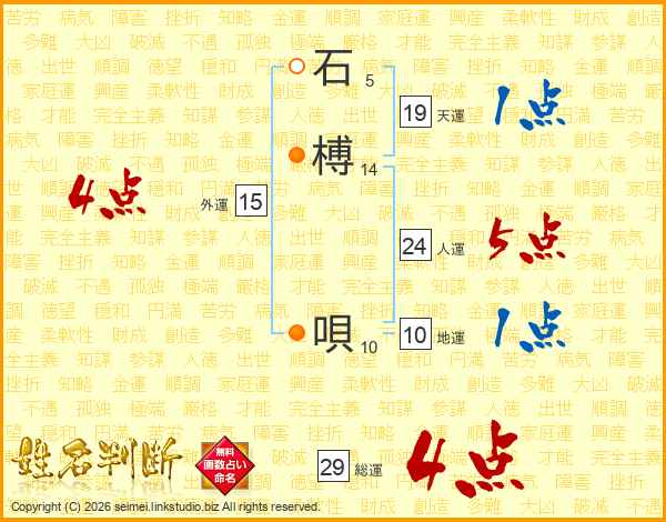 生活面を象徴する運勢です。外部から受ける影響力を表し、結婚運、家庭運や職場、環境への順応性を表します。総運から人運を引いた画数。姓や名が1文字の場合を除く。