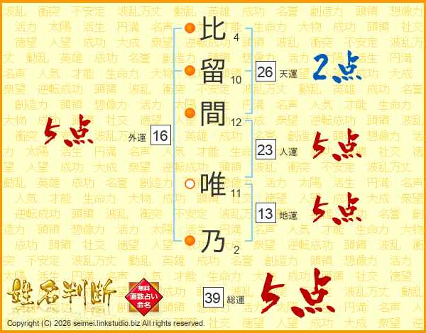 比(4画)留(10画)間(12画) 唯(11画)乃(2画)