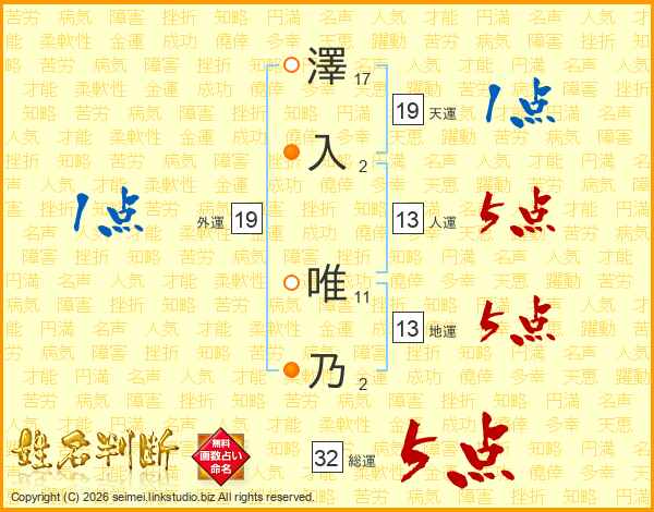 澤(17画)入(2画) 唯(11画)乃(2画)