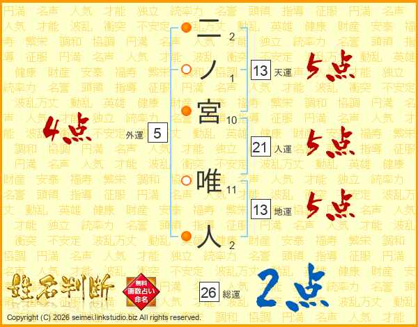 二ノ宮唯人さんの総運は26画の2点!