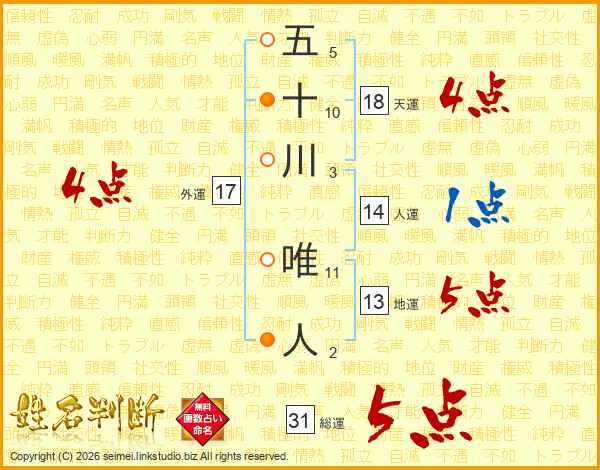 生活面を象徴する運勢です。外部から受ける影響力を表し、結婚運、家庭運や職場、環境への順応性を表します。総運から人運を引いた画数。姓や名が1文字の場合を除く。