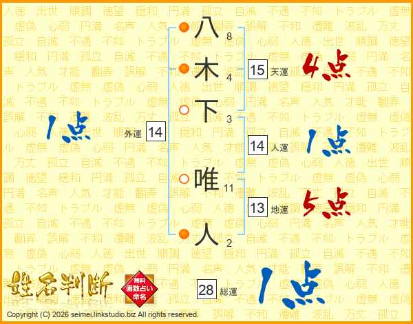八(8画)木(4画)下(3画) 唯(11画)人(2画)